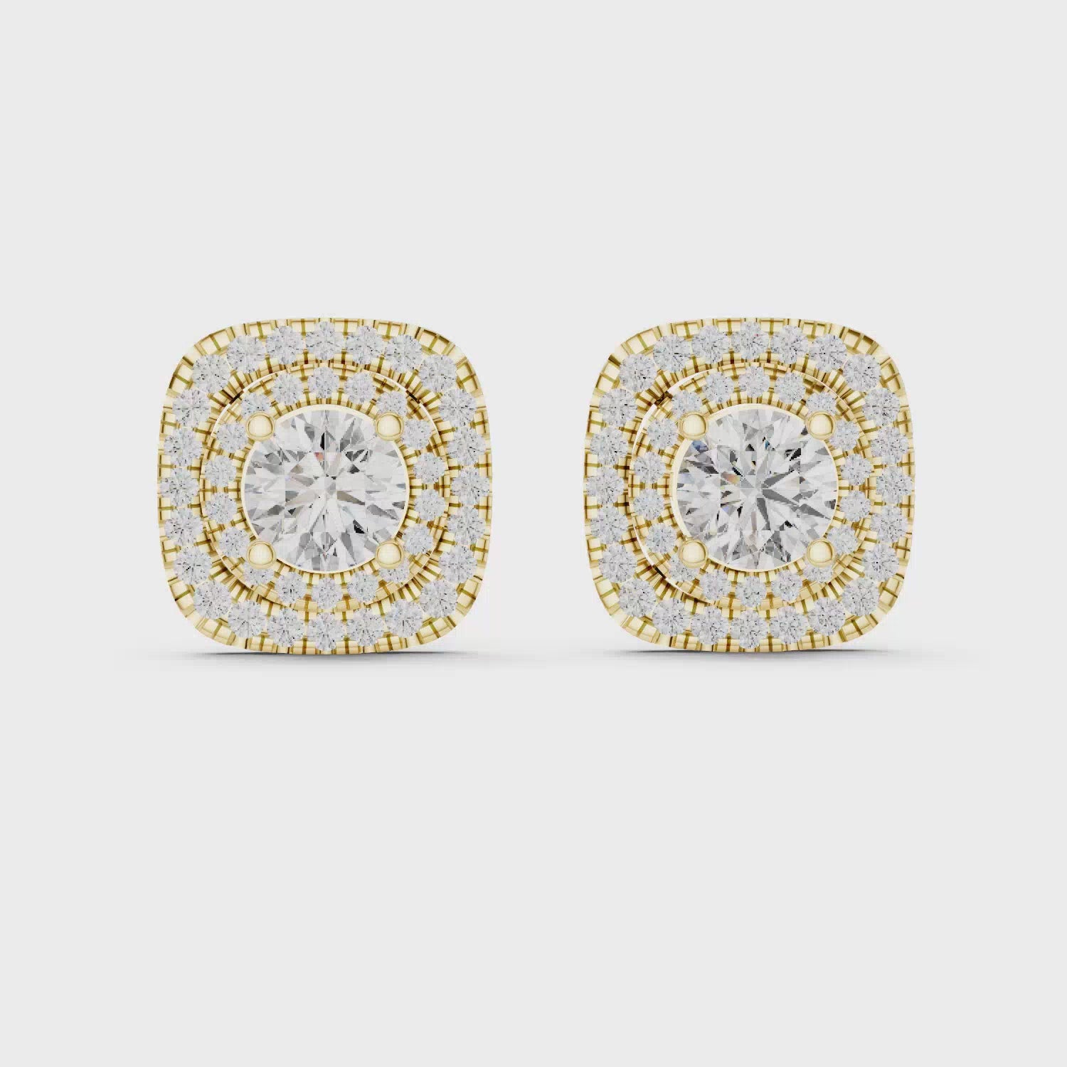 Each stud features a luminous round brilliant-cut center stone, surrounded by three concentric cushion-shaped halos meticulously set with precision-cut accent stones. This triple-layer construction creates exceptional depth, amplified sparkle, and a bold yet balanced presence—capturing the essence of fine statement jewelry crafted for everyday confidence and special occasions alike.